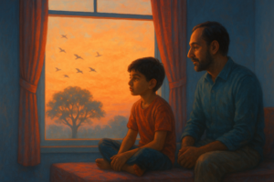 Ayaan sat by the window, watching the sky turn golden in the evening. Birds were flying home, trees moved gently with the wind, and everything felt calm. But inside, Ayaan had many questions.